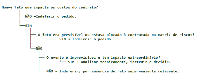 Essa estrutura simples, inspirada nas orientações do Manual do TCU, ajuda a padronizar a tomada de decisão e reforça a segurança técnica e jurídica das análises de reequilíbrio econômico-financeiro.
